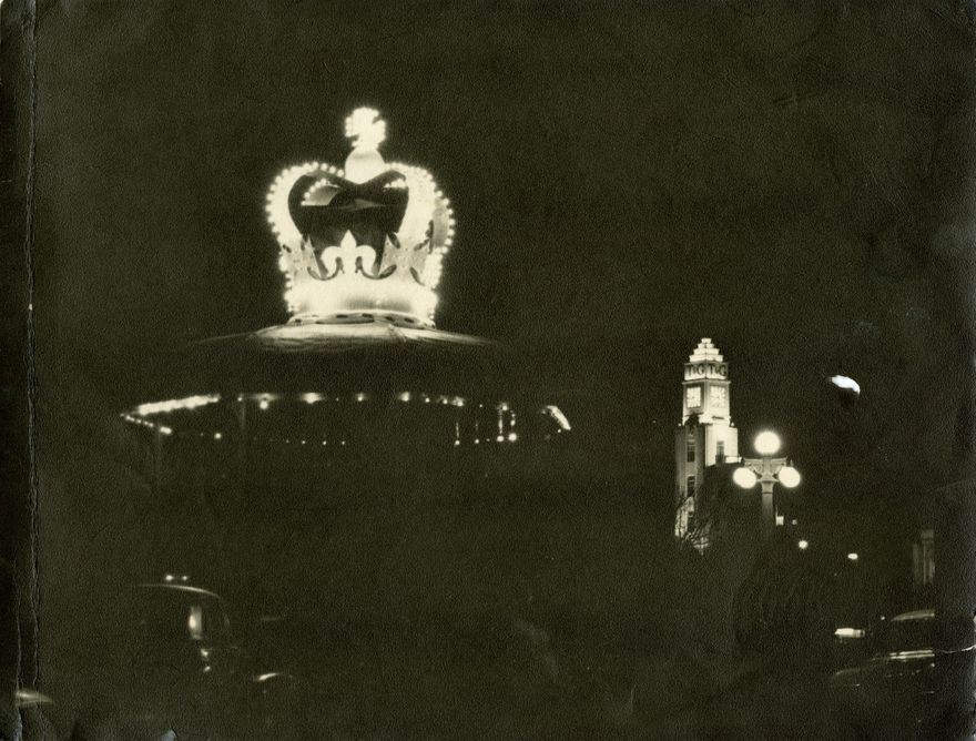 Queen Elizabeth II and Prince Philip, the Duke of Edinburgh, visited Palmerston North 6-7 January 1954, staying overnight at the Grand Hotel. A decorative crown was erected on top of the Band Rotunda, in honour of the visit. Behind the rotunda, the lit up T & G Tower is visible.