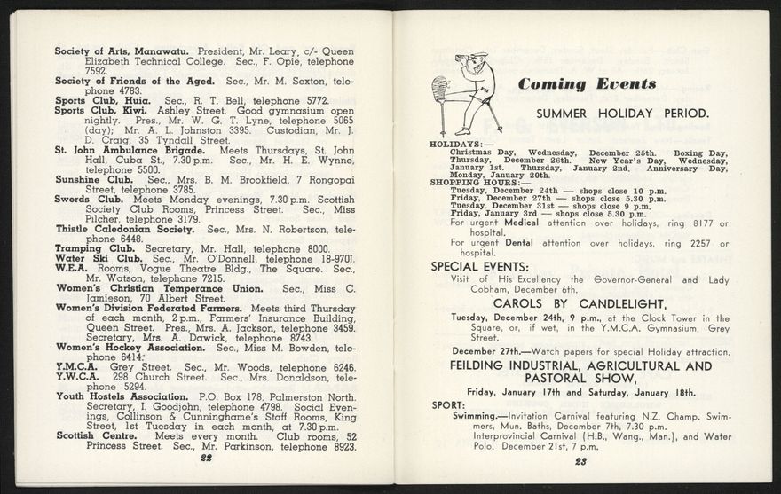An informational booklet published monthly by the Palmerston North Public Relations Organisation (Inc.) to provide information for visitors and new arrivals to Palmerston North.
