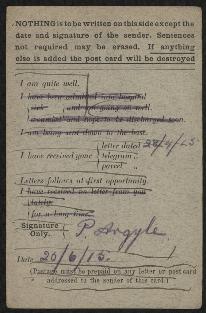 Postcard sent to Hector Argyle of Bunnythorpe, from his brother Pat (Percival) who was serving overseas in World War One. Nothing personal was written on these postcards, except for a name and date. Pat Argyle later died at Gallipoli in 1915.