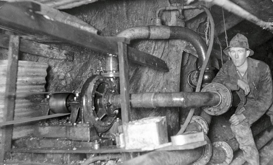 Mr Alex Grady surrounded by pipes in No. 2 tunnel, thought to be part of Arapeti dam.