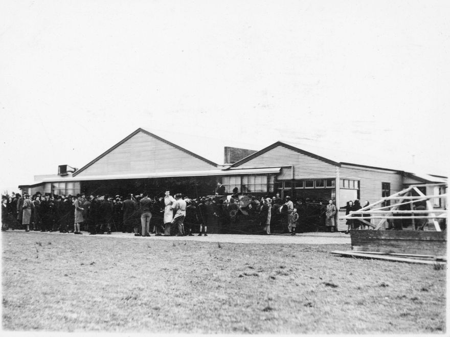 This photograph is thought to show an event at the Milson Aerodrome. It may show the opening of the Middle Districts Aero Club's new twin hanger and clubhouse in December 1938. Unfortuantely, on 17 February 1939 in a large fire which destroyed the clubhouse and twin hanger, along with aircrafts including the Porterfield ZK-AFS and two Tiger Moths (ZK-AFU and ZK-AGE).