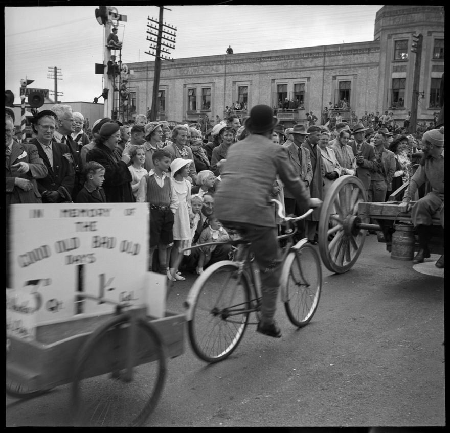 The celebrate the 75th Anniversary of Palmerston North, a programme of events was held from 15 to 22 March 1952. This included a parade around The Square of "Cavalcade of Transport Through the Ages," on the afternoon on Wednesday 19 March. In this photograph a cart and cyclist approach the Commercial Hotel on the corner of Main Street and Te Marae o Hine, The Square.