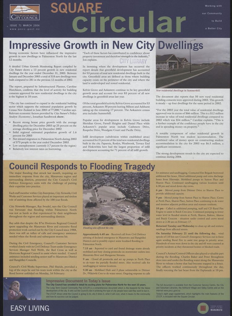 The Square Circular was Palmerston North City Council's monthly community publication, informing Palmerstonians of PNCC initiatives, activites, and events. This month's issue includes: archival photo, Callum Brown, Convention Centre, Destination Manawatū, Festival of cultures, flooding, George Street festival, residential housing, library, Long Term Council Community Plan, Manawatu Community Athletics Track, sister city, sports field, Square, Square Edge.