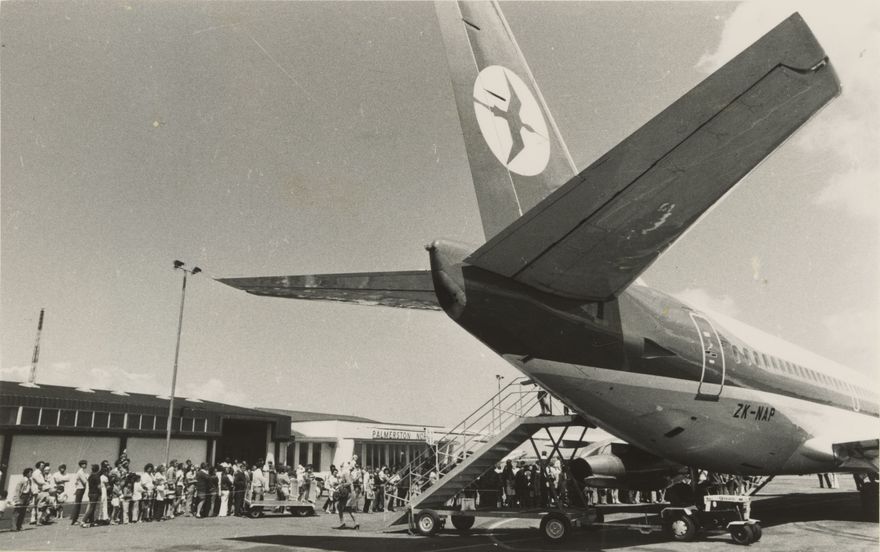 A Boeing 737 at Milson Airport with the Cargo depot (left) and the terminal building behind.