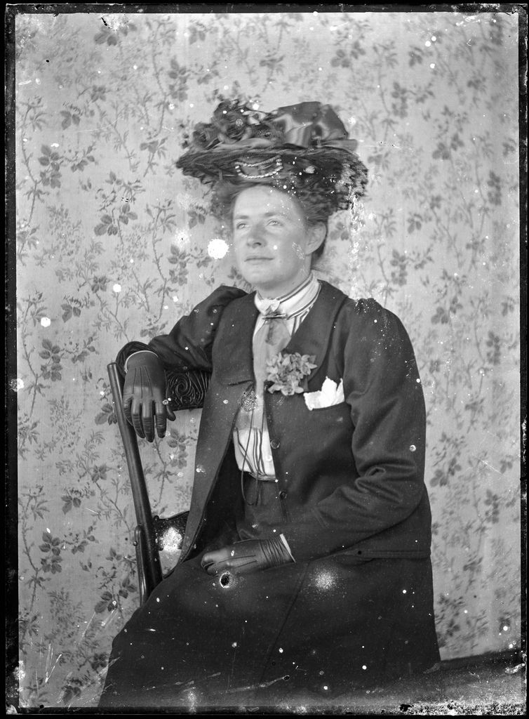 This photograph was created by William James Young in the early 20th century. A large variety of subjects are depicted in the collection, but family, rural life and travel are the most prominent themes. The exact location of the photographs in the Young Collection is unknown, but W J Young lived on a farm in Mt Stewart, Rangitikei, and some of the photographs include his house. The Young family were apparently avid travellers and photographs later in the collection feature scenes from Rotorua, Auckland, Whanganui, as well as other unidentified locations. The portraits are all unidentified, but are presumably of members of the Young family. The photographers parents were George Henry (b 1833) and Jane McDowell (b 1842, d 1916). They came to New Zealand in 1877. The same year, they bought the home farm on Mt Stewart and called it Kilrudden after Kilrudden House, the home of the McDowell family in Ireland. The couple had four children: Ann (b 1873), Margaret (b 1876), John (b 1878) and William James (b 1880). William James married Mary Elizabeth Thompson and they had four children: Doris (b 1914, d 1989), George (b 1916, d 1991), Royden McDowell (b 1925, d 1992) and Noel William (b 1927, d 2013).