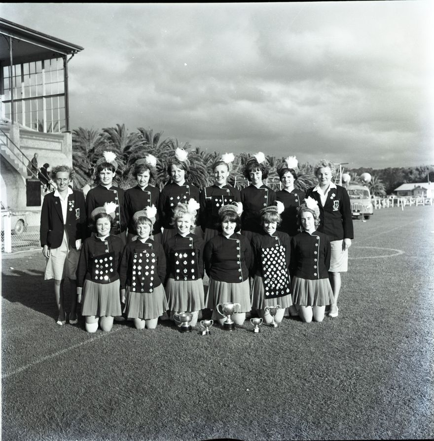 This photograph was taken for a story in the Manawatu Evening Standard, but the article could not be found. The image, taken on 22 February 1965, shows the Skylark Marching Team.