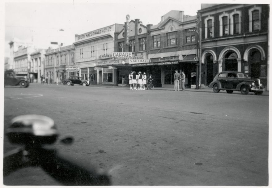 The south side of Rangitikei Street opposite Grey Street. The Square is in the distance (extreme left). Visible are Booth Macdonald and Co Ltd (farm machinery), Fowler Motors Ltd, Beatty Factory Branch, Simon Printing Co Ltd, Haydon Clothing Co Ltd. A group of marching girls in uniform can be seen in the centre of the image.