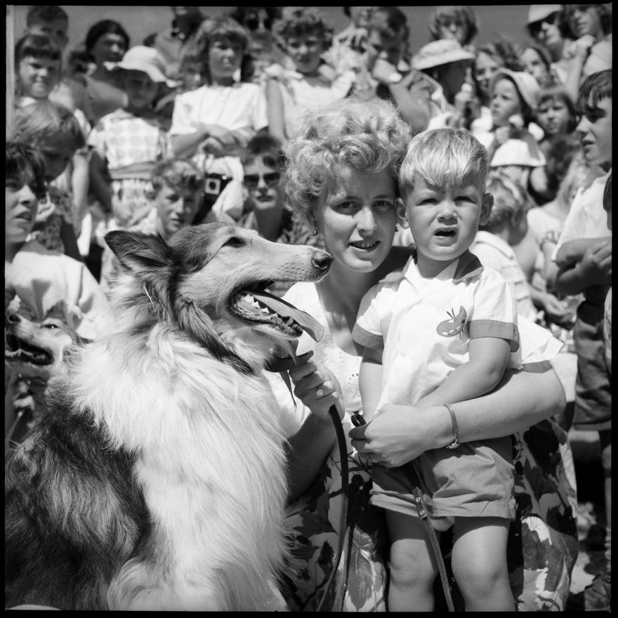 This image was taken for a story that ran in The Manawatu Evening Standard on 21st January, 1963. "With the judge's eagle eye on the parade of pets at the Carnival of the Lake, Trixie the collie was quite unperturbed. Her master, Kim Buick, found it a thoughtful matter indeed and in his anxious moments nearly chewed through the leather lead".