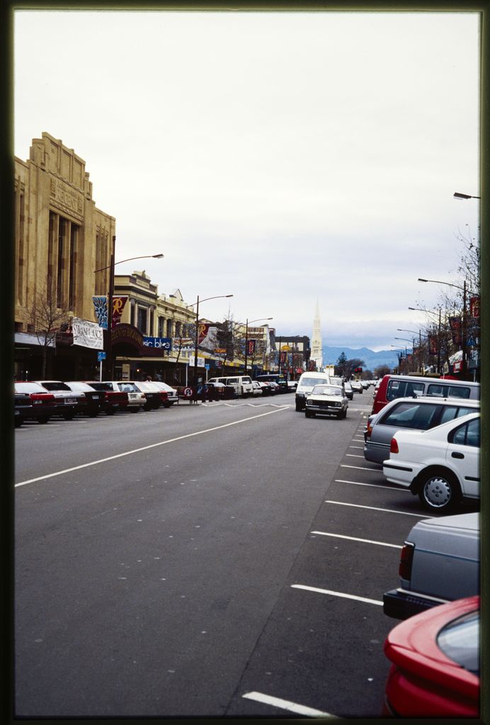 Looking down Broadway towards St Patrick's Catholic Cathedral in the distance. To the left can be seen the Regent Theatre.