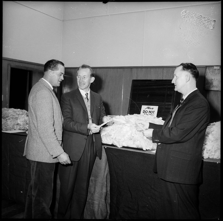 This image was not published in the Manawatu Evening Standard, taken on 03 July, 1963. [Three men admire and study a fleece. It is on a table with two other fleeces.]