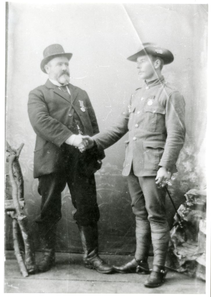 An undated portrait of an unidentified soldier shaking hands with an unidentified man.
