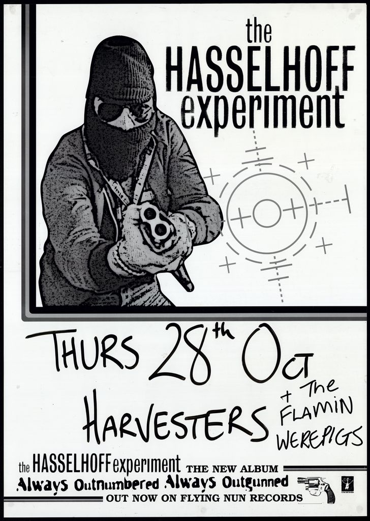 The Hasselhoff Experiment. Thurs 28th Oct. Harvesters. The Flamin Werepigs. the Hasselhoff Experiment. The new album Always Outnumbered Always Outgunned. Out now on Flying Nun Records. Part of a collection of posters that were displayed at The Stomach, Lombard Street, venue for Creative Sounds Society Incorporated.