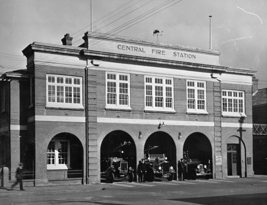This Fire Station was opened in 1926, the second to be built in Cuba Street. Two of the Fire Engines seen in the photo were in use at the old Fire Station and the third engine was purchased when this Station was constructed.