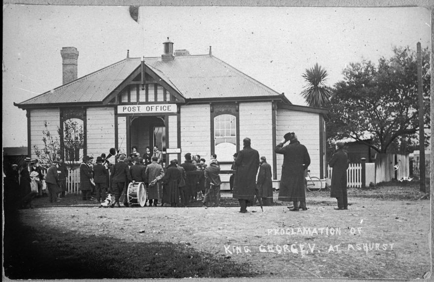 A group gathering outside the Ashhurst Post Office to hear the proclamation of the accession of George V, who was proclaimed King of the United Kingdom and British Dominons, and Emperor of India, after the death of his father King Edward VII. King George V was monarch until his death on 20 January 1936. The Ashhurst Post Office was built in 1897. In October 1991, the building was purchased by the Palmerston North City Council and became a branch of the Palmerston North City Library.