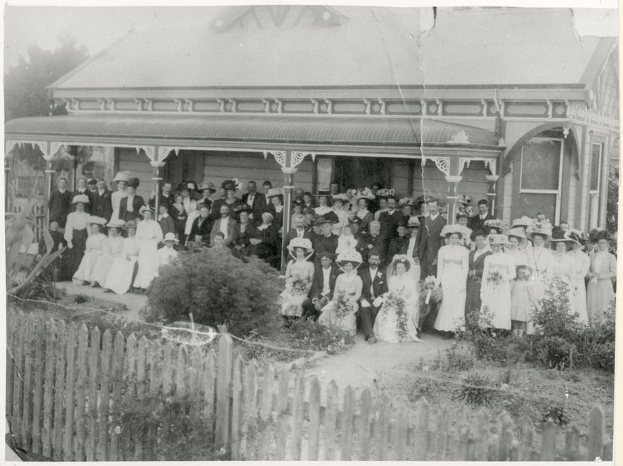 Mr and Mrs Roley Pearson were the parents of George and Trevor Pearson. This gathering is in front of H H Hunt's house, which was still standing in 1979.