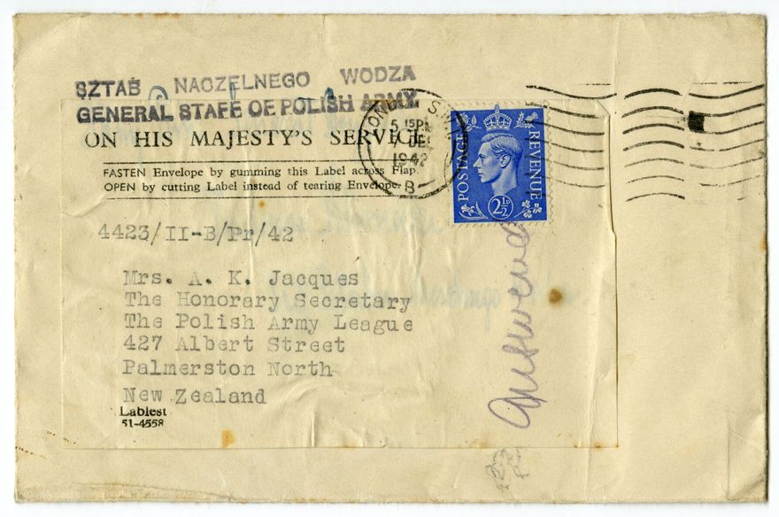 Envelopes addressed to the Polish Army League, from the General Staff of the Polish Army in London, to the Polish Army League in Palmerston North. Sent on Her Majesty's Service. The Polish Army League, founded in Palmerston North in WWII, corresponded with and sent parcels to Polish soldiers who served with the allies in World War Two.