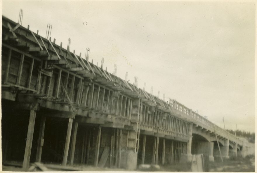 The Fitzherbert Bridge, spanning the Manawatu River, Palmerston North, was built 1933 – 1935. This view shows the preparations for the construction.