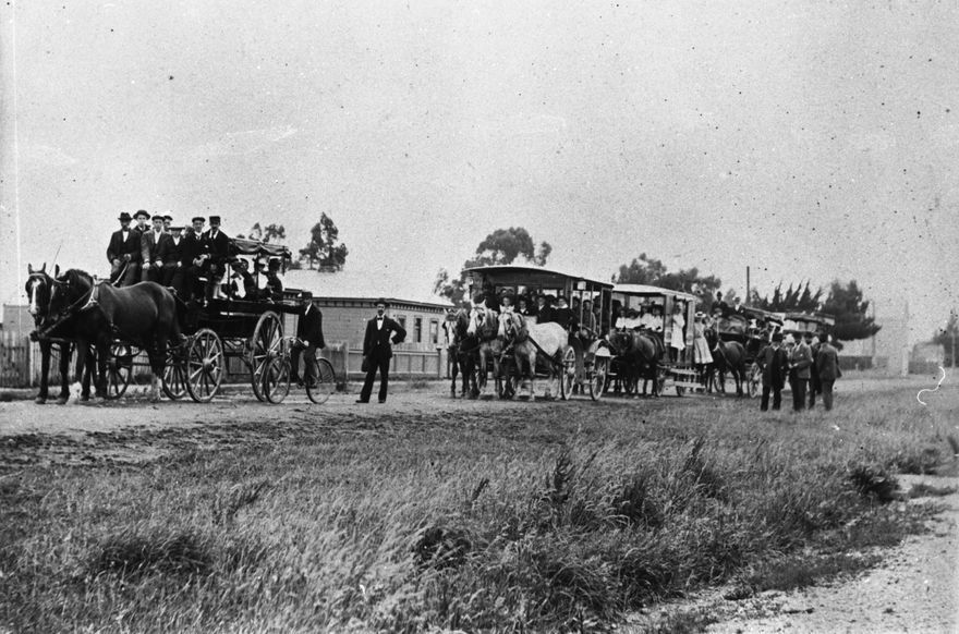 A Methodist church group on Broad Street setting off for a picnic in horse drawn carriages.