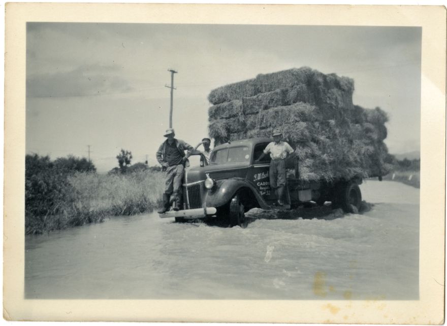 This photograph shows a truck loaded with hay bales to keep them out of the floodwaters. One of the men is Norm Terry. The truck was owned by a local carrier firm by the name of J.W. Cooksley. The 1953 Rangiotu Flood was one of the largest floods for the Oroua River on record.