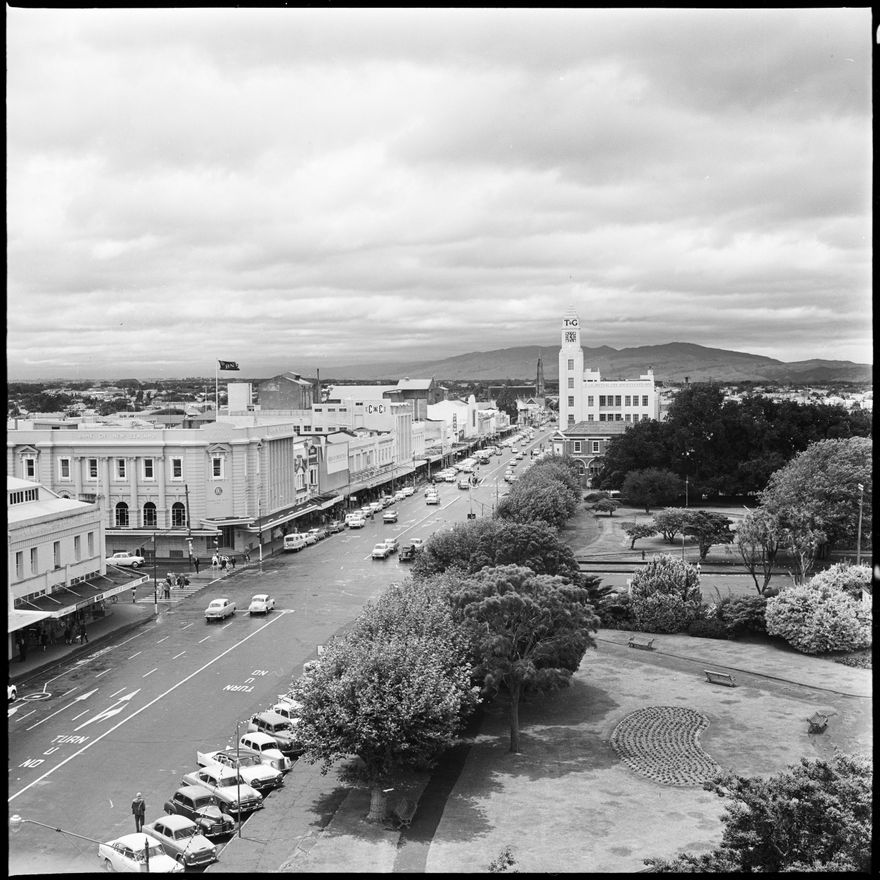 This image was taken for a story that ran in The Manawatu Evening Standard on 29th December 1965 "With the city shops open for the first day after Christmas, this morning's weather did little to help. Blustery winds and rain kept many at home and this scene looking along Broadway during the lunch hour reflects the mood."