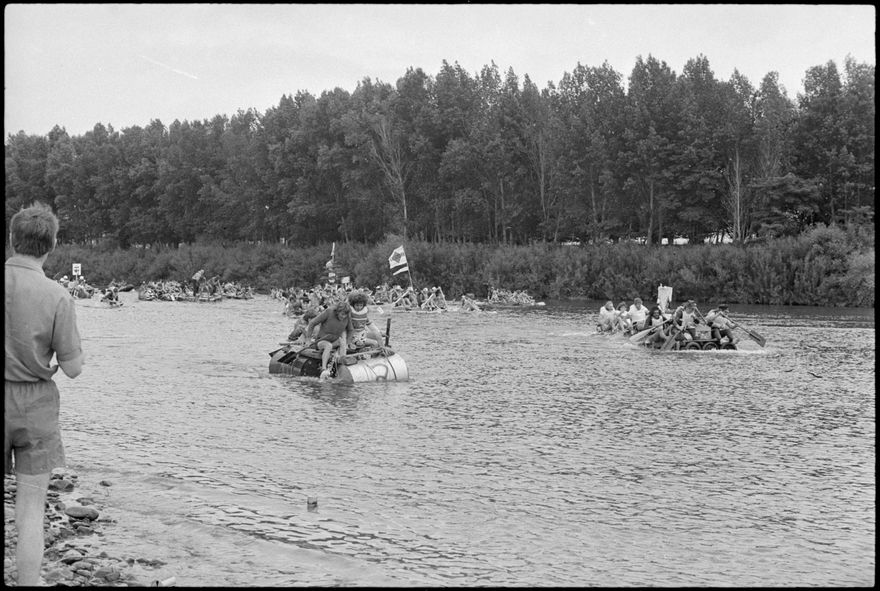"An 88-strong armada of rafts makes its way down the Manawatu River yesterday during the Awapuni Jaycees' fourth annual raft race. The 5.2-mile race, from Te Matai Road to the Fitzherbert Avenue Bridge was won by a six-man crew from the Valuation Department."... "Second place went to the Maw Haws Social Club"... "and third to the Mr Whippy Icecream raft."