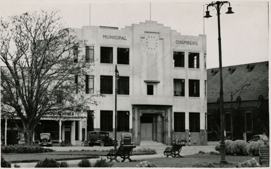 The Municipal Chambers, designed by R and W Thorrold-Jaggard replaced the earlier (1905) building on the site, they were opened on 13 June, 1945 and this shot apparently taken in springtime, may be either from earlier in 1945 (since the rooms look unoccupied) or from early 1946 (since the electric clock was not added until later). Thorrold-Jaggard papers, especially volumes III and IV; IV, 12 includes a defence of the Thorrold-Jaggard art deco style of architecture.