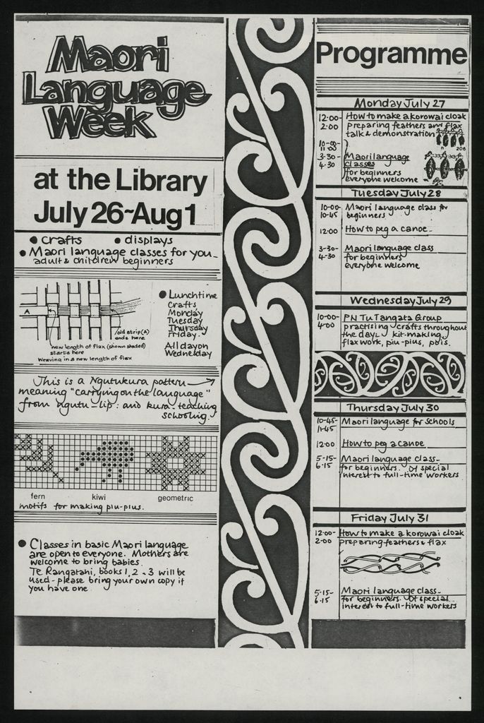 "Maori Language Week at the Library July 26-Aug 1. Crafts. Displays. Maori language classes for you - adult & children beginners. Lunchtime crafts Monday, Tuesday, Thursday, Friday. All day Wednesday. Classes in basic Maori language are open to everyone, Mothers are welcome to bring babies. Te Ranagtahi, books 1,2 & 3 will be used - please bring your own copy if you have one. Programme. Monday July 27. How to make a Korowai cloak, preparing feathers and flax & demonstration. Maori language classes for beginners everyone welcome. Tuesday July 28. Maori language class for beginners. How to peg a canoe. Maori language class for beginners everyone welcome. Wednesday July 29 PN Tu Tangata Group. Practising crafts throughout the day. Kit making, flax work, piu-pius, pois. Thursday July 30. Maori language for schools. How to peg a canoe. Maori language class for beginners. Of special interest to full-time workers. Friday July 31. How to make a korowai cloak, preparing feathers & flax. Maori language class for beginners. Of special interest to full time workers." Part of a collection of posters that were displayed in the Public Library in the 1970s - 1980s.