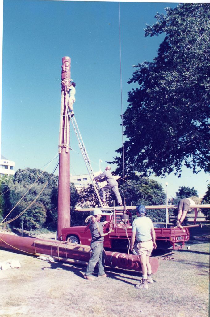 Council staff assisted by John Bevan Ford, install pouwhenua before the re-dedication of The Square as ‘Te Marae o Hine’ – The Courtyard of the Daughter of Peace. The re-dedication occurred on Saturday, 3 March, 1990