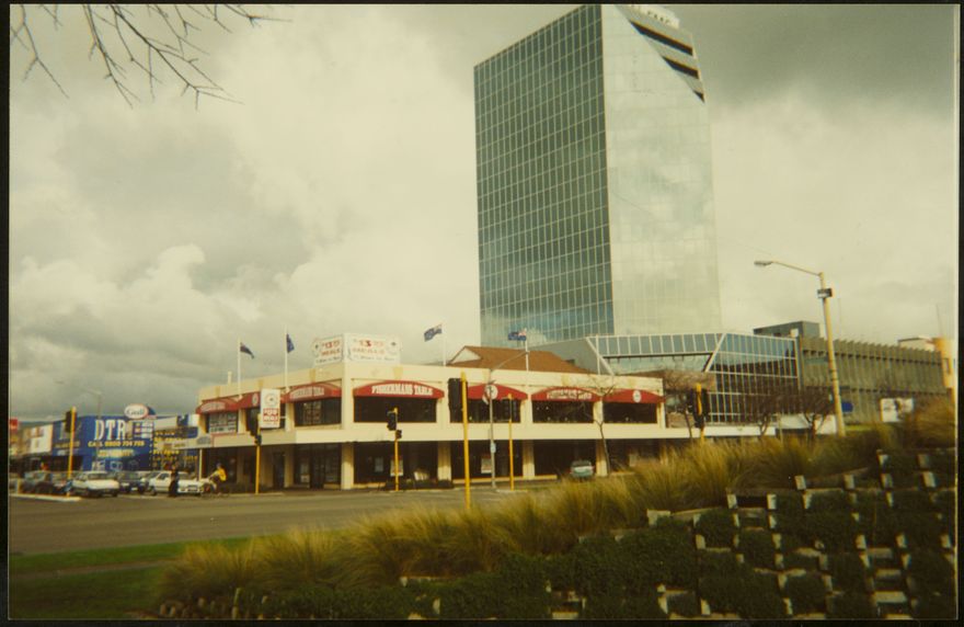 This photograph shows the intersection between The Square and Fitzherbert Avenue. The multi-storied building is FMG House. The red and white building is the Fisherman's Table restaurant.