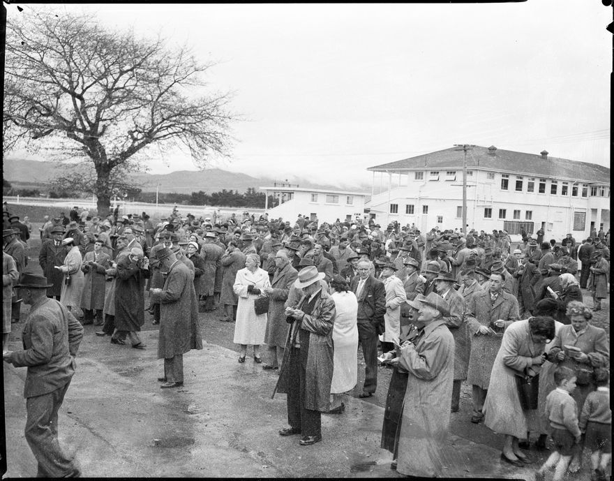 This image was taken for a story that ran in The Manawatu Evening Standard on 15 June, 1959. "Raincoats were the order of the day for most patrons at Awapuni on Saturday. Here is the crowd studying the doubles totalisator. The woman in the right-hand bottom corner appears to have made up her mind."