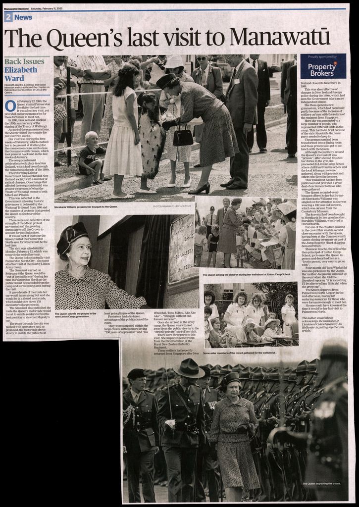 Local historians weekly "Back Issues" article in the Manawatū Standard. On 12 February 1990, Queen Elizabeth II visited Linton Army Camp, part of a two week royal tour that marked New Zealand's 150th anniversary of the signing of the Treaty of Waitangi.