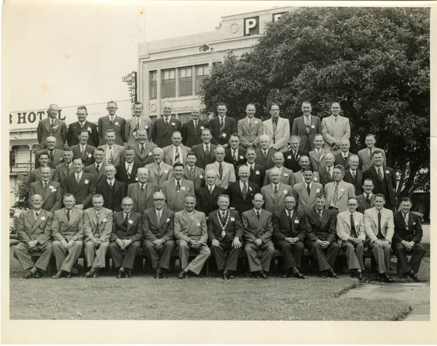 A group photograph of those attending the New Zealand Master Grocers' Federation Annual Conference. The conference was held in Palmerston North during 1953. The individuals are unidentified. Harry Jackson may be on the far left of the second row from the top.