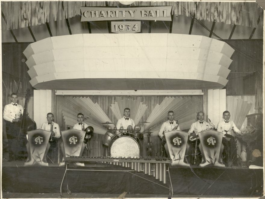This photograph shows the musical act for a charity ball in 1934. The men are unidentified.