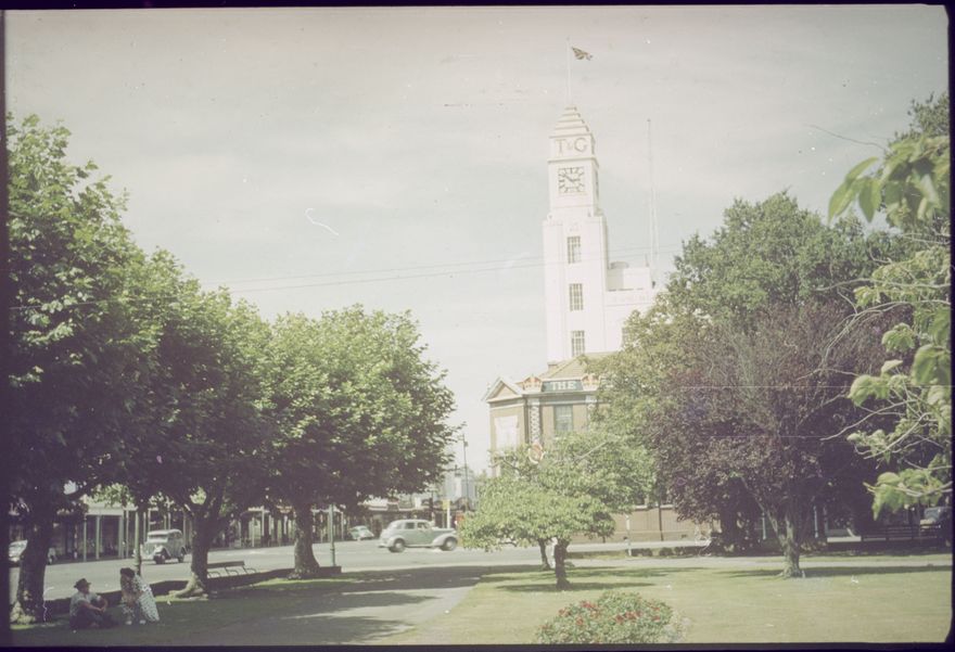 Queen Elizabeth II and Prince Philip, the Duke of Edinburgh, visited Palmerston North 6-7 January 1954, staying overnight at the Grand Hotel. The city was decorated to welcome them. The T&G Building is shown here flying the British flag and the Bank of Australasia (brick building in front) is decorated with crowns.