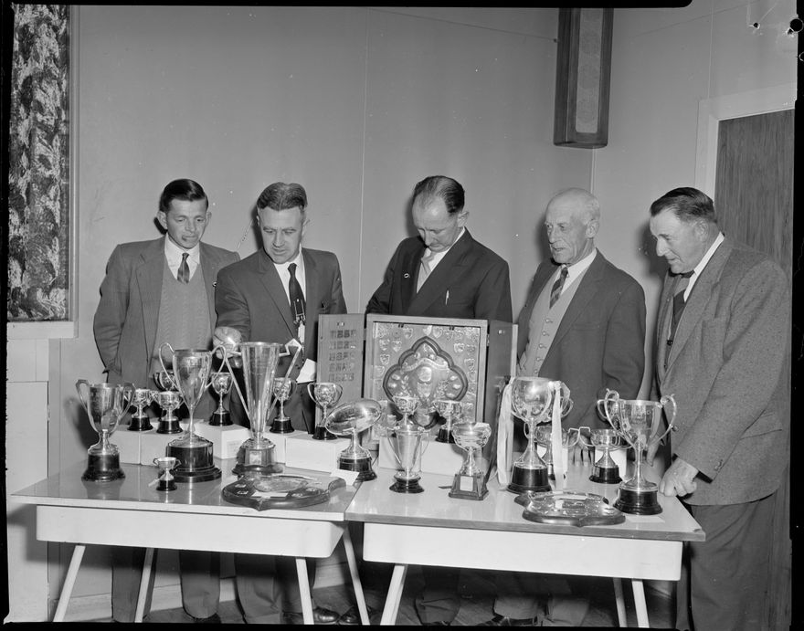 This image was taken for a story that ran in The Manawatu Evening Standard on August 1960 "The impressive array of Rugby trophies was presented at the annual dinner of the Technical Old Boys' Club last night. Over 250 members were present to see J. Hibberd, the Manawatu fullback and the captain of the T.O.B. senior side, receive the Hankina Shield, the large trophy at the back, from the chairman of the Manawatu Rugby Union management committee (Mr. J. Payne). The trophy is awarded to the team winning the senior competition. In the picture, members of the club are seen admiring the array. Second from the right is the club's patron (Mr. A.D. Lynch)."