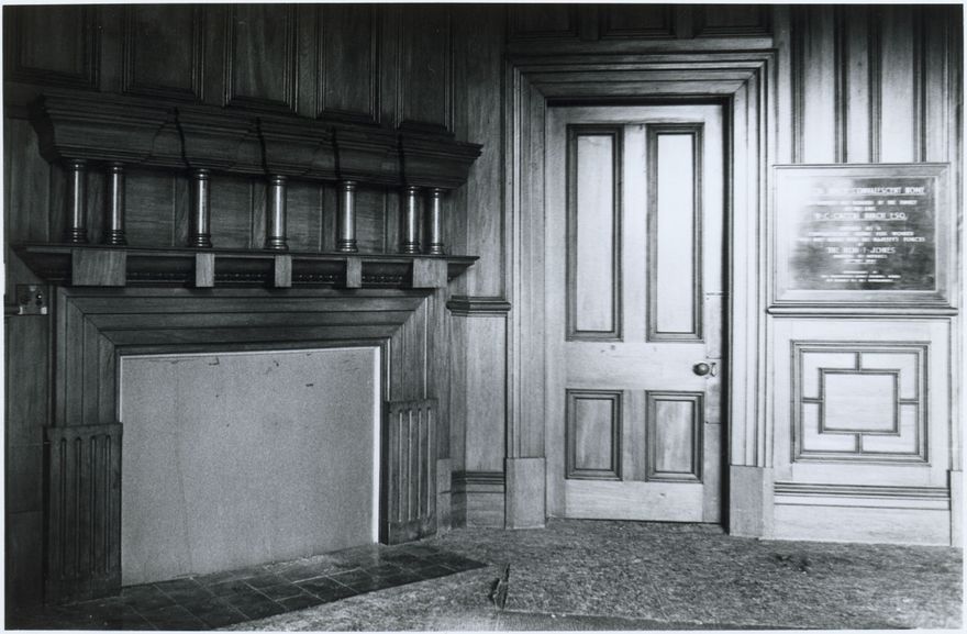 Caccia Birch, as it is known today, was designed by L G West and built for Jacob Nannestad, a sawmiller, in about 1892. After being sold to Jack Strang in 1903 the house was extensively enlarged, both by him and by the New Zealand Government during the time it was leased to them for use as Government House 1908-1910. In 1921 the house was sold to William Caccia Birch. After Caccia Birch's death it was gifted to the NZ Government, in 1941, and was variously used by the army in WWII, as a convalescent home for nurses, and by both Victoria and Massey Universities. The house has been owned by Palmerston North City Council since 1984 and has been restored and renovated as a conference and function centre. It is a Category 1 listed building with the New Zealand Historic Places Trust because of its historical and architectural and community significance. At the time of this photograph the home was in a state of disrepair. The door into the hall, the wall paneling and the fireplace are all of kauri.