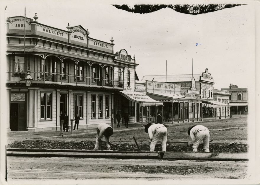 E mahi ana ēnei tāne i runga i te rerewē e whiti ana i te Marae o Hine ki Papaiōea. Railway workers working on the railway line through The Square.