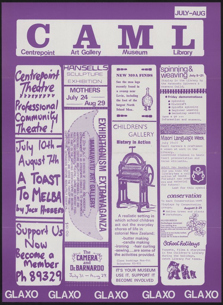 A poster advertising events at Centre Point theatre, the Manawatū Art gallery, Manawatū Museum, and the City Library.