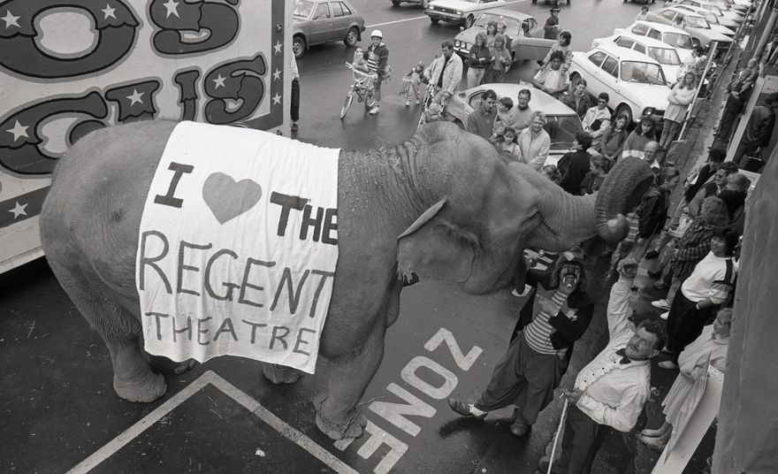 This image was taken for a story that ran in The Manawatu Evening Standard on 15 May 1989 with the caption : "Sole Brothers' Circus' Minyak rallies for the cause outside the Regent Theatre on Saturday." Minyak wore banners with slogans aimed at convincing passers-by to sign a petition to save the Regent Theatre from demolition. 1500 people signed the petition during the stunt.