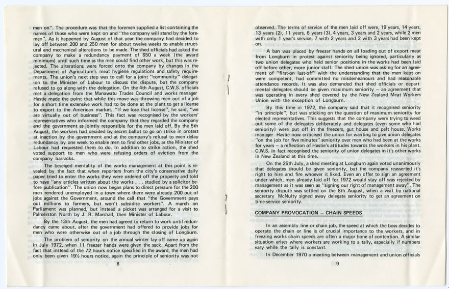 This booklet outlines industrial disputes at the Longburn freezing works during the 1970s, specifically: disputes over operating temperatures at extremes of both heat and cold; disagreements between workers and management over the roles of foremen and leading hands; pay disputes; and general working conditions and workloads.