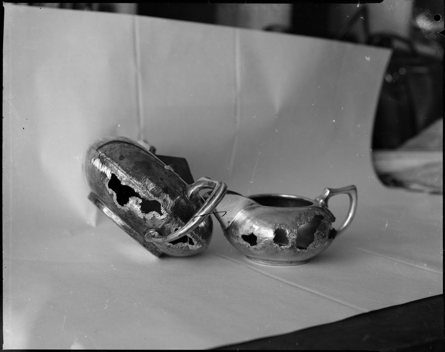 This image was taken for a story that ran in the Manawatu Evening Standard on 11 April 1963, "A Kairanga resident received a shock last week. Two years ago he placed a silver tea service in a box and put it into a cupboard. Last week he went to get the set out and found that rats had been to the cupboard and had completely destroyed the silver set. Holes had been chewed through every piece. The teethmarks can be clearly seen round each of the holes."