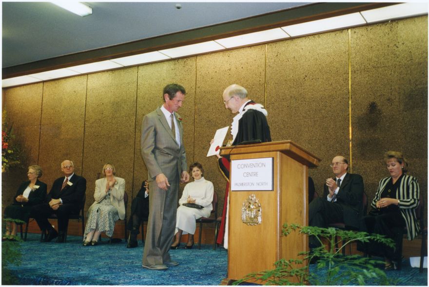 On the occasion of the Ashhurst (former) Post Office building's centenary, Paul Rieger presents an award in the Convention Centre in Palmerston North. The building is now used at the town library.
