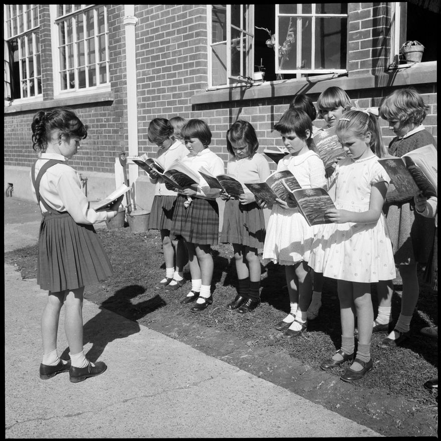 This image was taken for a story that ran in The Manawatu Evening Standard on 24 April 1963 "Play reading outside in the sun was much more fun for these Standard II pupils of the West End School. Part of the group is seen here."