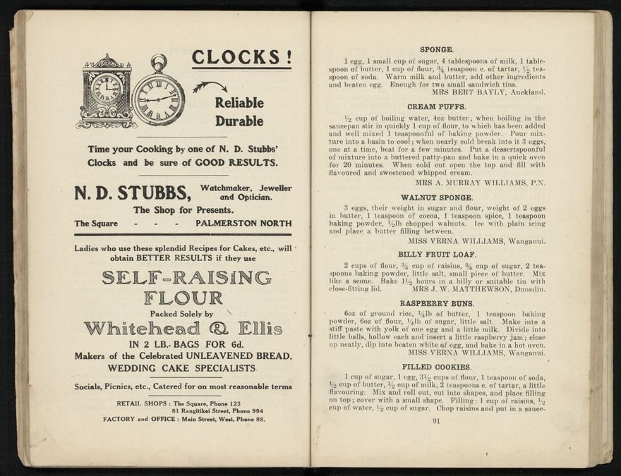 The recipes from this book were contributed to the Patriotic Society from around the region. Chapters include food items like biscuits, soups, "made up dishes" and egg dishes, but there are also chapters about beverages, sauces and "miscellaneous" - with entries like homemade floor polish, soap, waterproof dressing and cough mixture. Alongside these recipes, there are many interesting advertisements from the local businesses of Palmerston North.