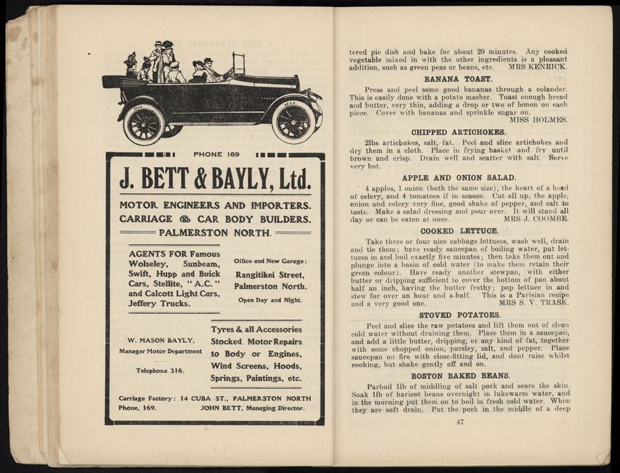 The recipes from this book were contributed to the Patriotic Society from around the region. Chapters include food items like biscuits, soups, "made up dishes" and egg dishes, but there are also chapters about beverages, sauces and "miscellaneous" - with entries like homemade floor polish, soap, waterproof dressing and cough mixture. Alongside these recipes, there are many interesting advertisements from the local businesses of Palmerston North.