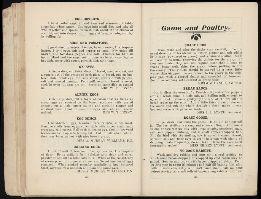 The recipes from this book were contributed to the Patriotic Society from around the region. Chapters include food items like biscuits, soups, "made up dishes" and egg dishes, but there are also chapters about beverages, sauces and "miscellaneous" - with entries like homemade floor polish, soap, waterproof dressing and cough mixture. Alongside these recipes, there are many interesting advertisements from the local businesses of Palmerston North.