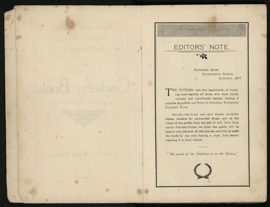 The editor's note says this about the book, "Our aim was to try and give simple, everyday dishes suitable for economical times and as the whole of the profits from the sale of this little book are for Patriotic Funds, we trust the public will be lenient and overlook all deficiencies and help to swell the funds by not only buying a copy, but recommending it to their friends."