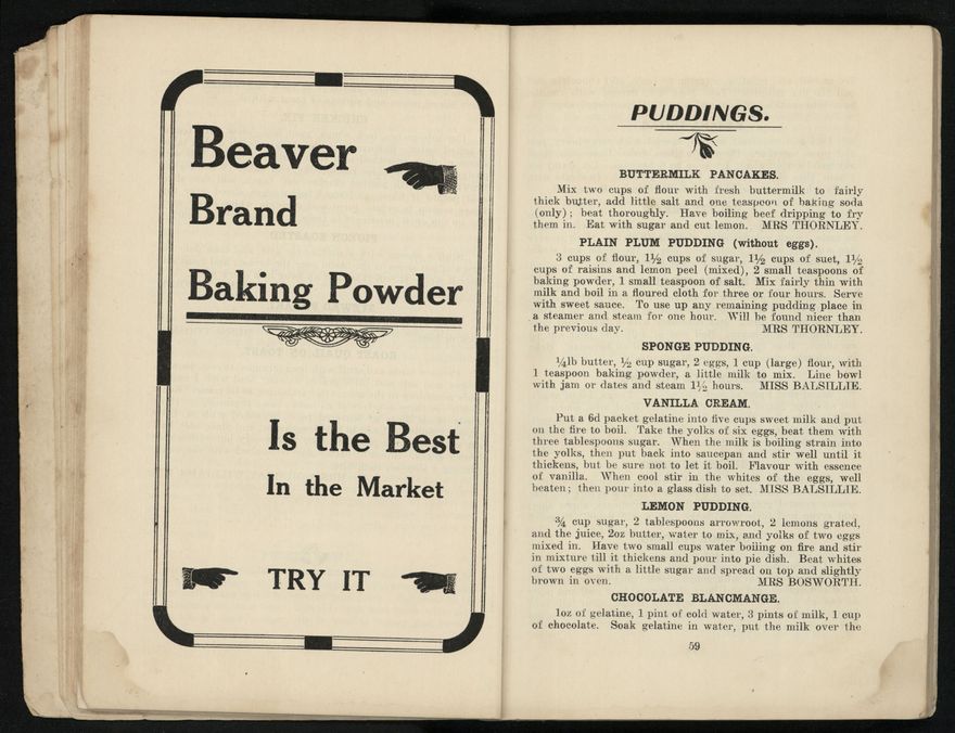 The recipes from this book were contributed to the Patriotic Society from around the region. Chapters include food items like biscuits, soups, "made up dishes" and egg dishes, but there are also chapters about beverages, sauces and "miscellaneous" - with entries like homemade floor polish, soap, waterproof dressing and cough mixture. Alongside these recipes, there are many interesting advertisements from the local businesses of Palmerston North.