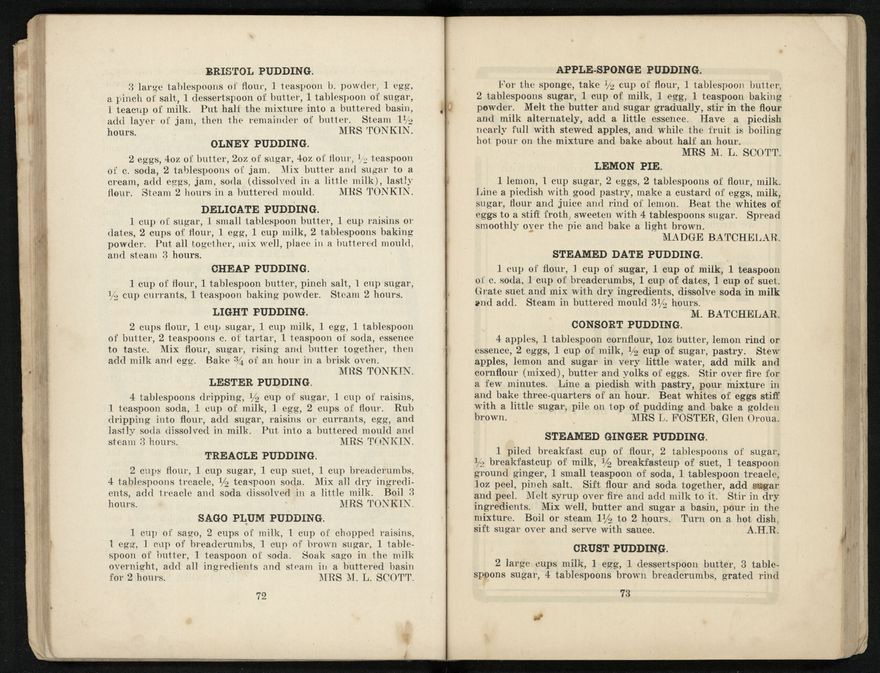 The recipes from this book were contributed to the Patriotic Society from around the region. Chapters include food items like biscuits, soups, "made up dishes" and egg dishes, but there are also chapters about beverages, sauces and "miscellaneous" - with entries like homemade floor polish, soap, waterproof dressing and cough mixture. Alongside these recipes, there are many interesting advertisements from the local businesses of Palmerston North.
