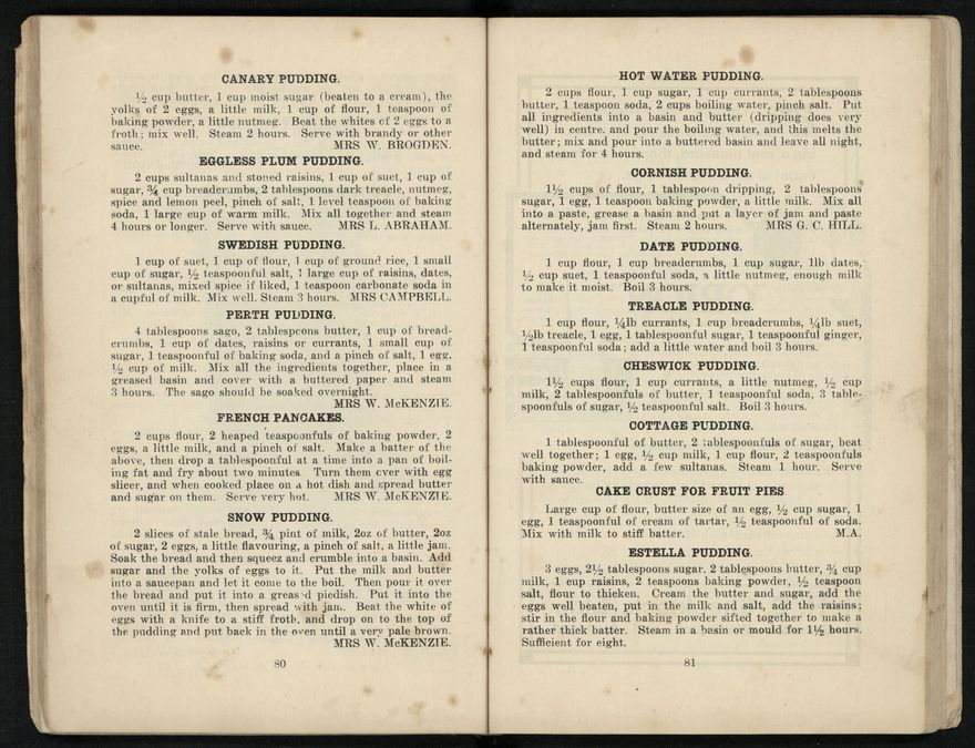 The recipes from this book were contributed to the Patriotic Society from around the region. Chapters include food items like biscuits, soups, "made up dishes" and egg dishes, but there are also chapters about beverages, sauces and "miscellaneous" - with entries like homemade floor polish, soap, waterproof dressing and cough mixture. Alongside these recipes, there are many interesting advertisements from the local businesses of Palmerston North.
